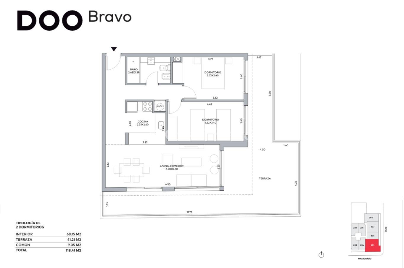Unidad de 68 m2 internos y terraza de 41 m2. Orientación sureste.