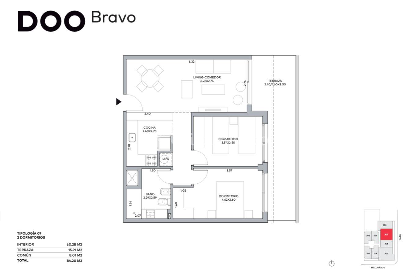 Unidad de 60 m2 internos y terraza de 16 m2. Orientación este.
